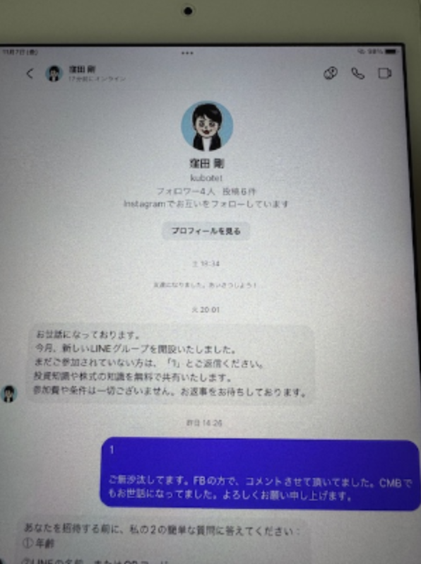 窪田を名乗る人物が、投資情報を発信、参加者は数名。