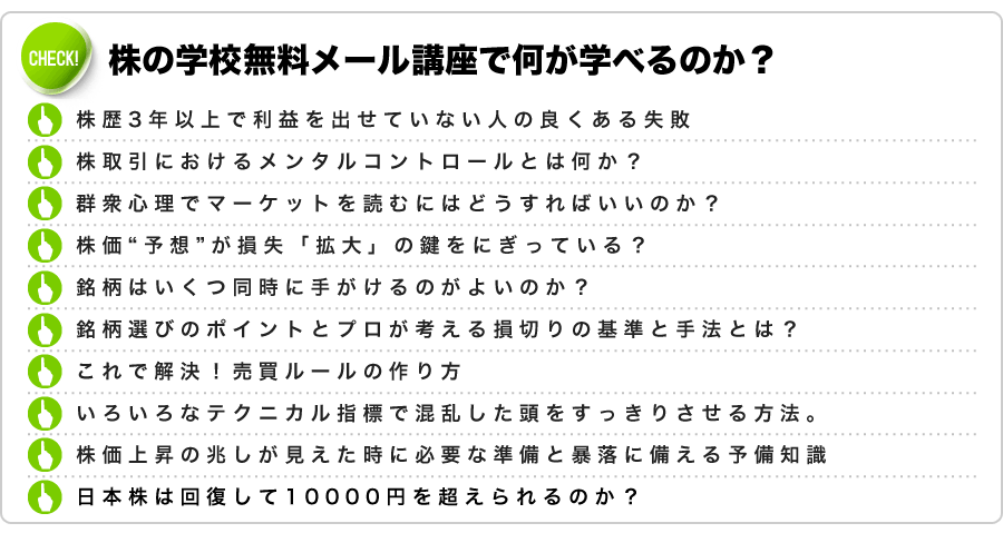 そして、この特別なレポートを「株の学校」無料メール講座に、 ご登録いただいた方全員にプレゼントしています。