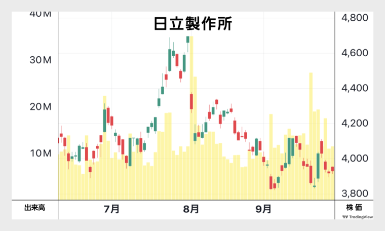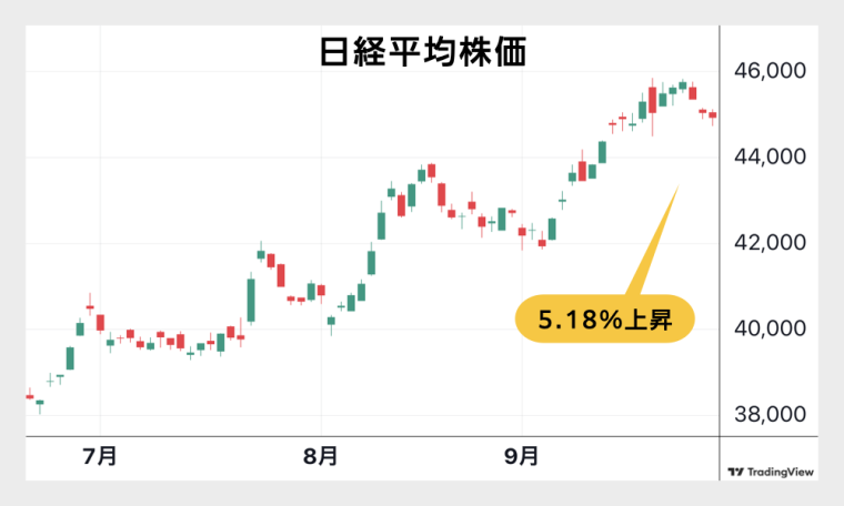 8月に史上最高値を更新し、そのままの勢いで9月19日に45,852円をつけました。引き続き強く推移していますが、22日を過ぎたあたりから今回の上昇を牽引していた生成AI・半導体関連銘柄の上昇に一服感が出てきています。