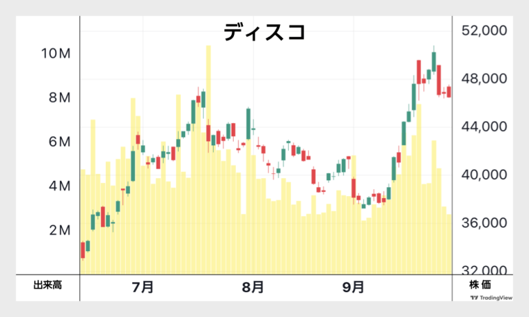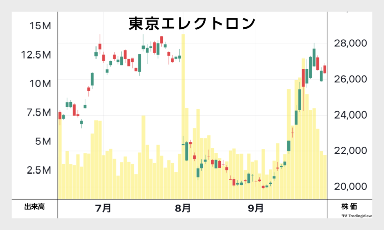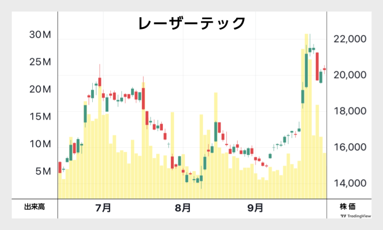さらに、出遅れいていた半導体関連のディスコ(6146)、東京エレクトロン(8035)、レーザーテック(6920)など、数年前に相場を牽引していた銘柄で長らく調整していた銘柄たちも大きく上昇しました。