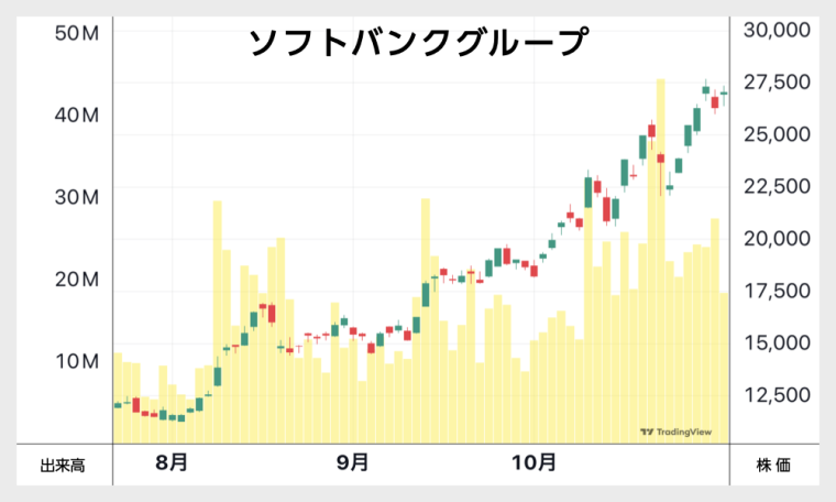 【第1位】ソフトバンクグループ<9984> ・・・・・・・・ 11.51兆円(先月5.04兆円)/値上がり率27位:+44.8%(18,685円→27,065円)