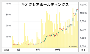 【第7位】キオクシアホールディングス<285A> ・・ 3.68兆円(先月1.67兆円)/値上がり率1位:+122.0%(4,875円→10,825円)