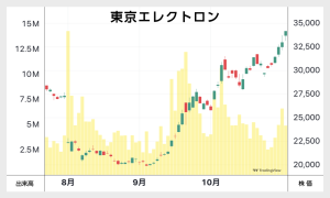 AI・半導体関連銘柄のなかでも特にすごかったのがこの3銘柄です。時価総額が大きいのに上昇率はこのとおり。まるで小型株や仕手株のような動きです。