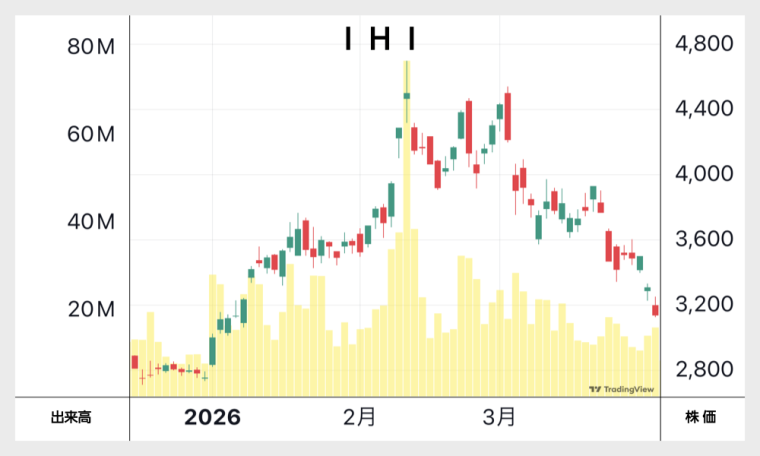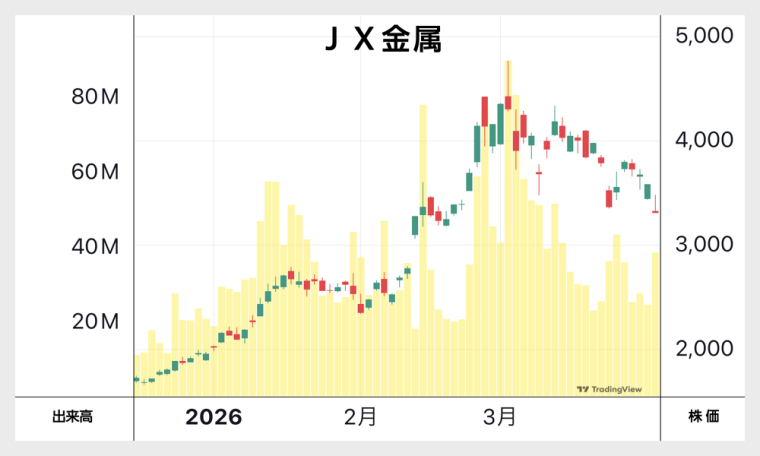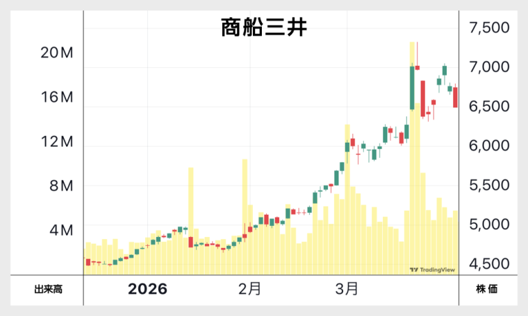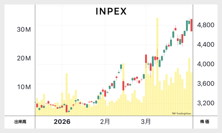 産油国であるイランが攻撃され、報復攻撃で同じく産油国のUAEが被害を受け、原油価格の主要な指標であるWTIは、2月末は65ドルでしたが3月末には105ドルと、1か月で約60%も値上がりしました。この上昇を受けて、INPEXの株価は上昇することとなりました。