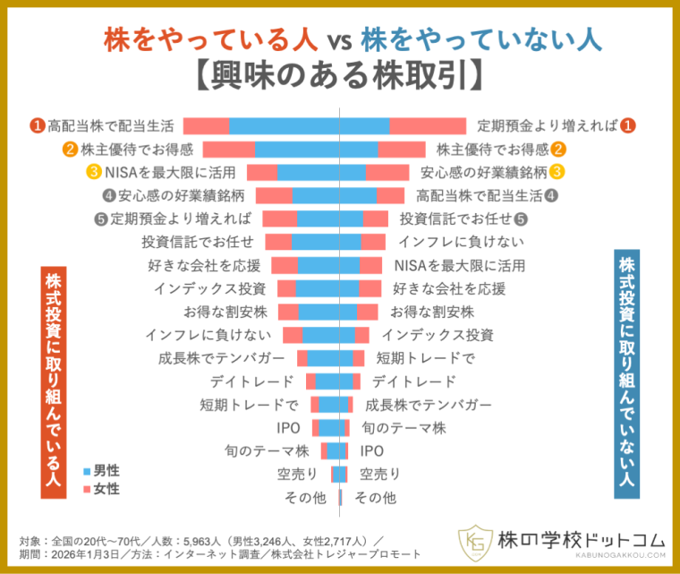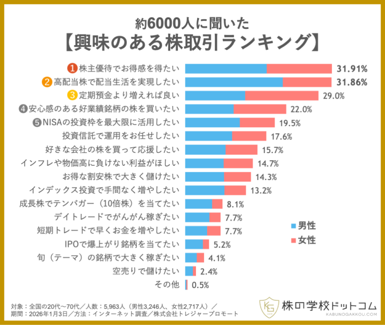 オンライン株式スクール「株の学校ドットコム」(運営会社:株式会社トレジャープロモート、東京都千代田区、代表取締役社長:瀬川 丈)は、全国の約6000人を対象に「興味のある株取引」についての意識調査を実施しました。