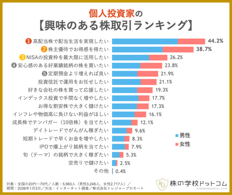 続いて、3位「NISAの投資枠を最大限に活用したい」(26.2%)、4位「安心感のある好業績銘柄の株を買いたい」(23.8%)、5位「定期預金より増えれば良い」(21.9%)となっています。